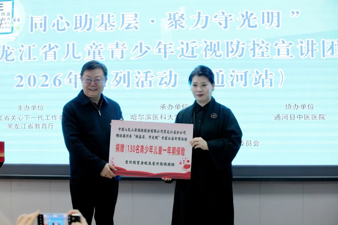启动仪式上,秦恩亭主任代表捐赠方向通河县教育局捐赠了学生意外伤害保险单,为青少年的健康成长增添了一份切实的保障。贾杰副主任在会上详细介绍了近年来省关工委与省教育厅关工委联合开展的“明亮眼睛”关爱行动情况。她高度赞扬了各方专家在青少年视力防控工作中满怀热忱、无私奉献的精神,以及取得的良好社会反响。贾杰副主任呼吁,希望以此次宣讲活动为契机,能带动更多热心人士和专业力量加入“明亮眼睛”行动,共同为孩子们的光明未来筑基。