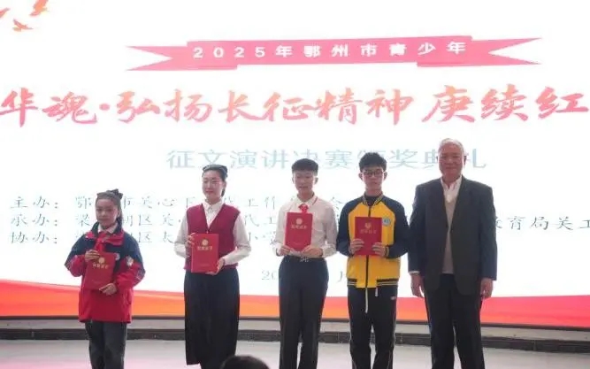 1月8日,湖北省鄂州市2025年青少年“中华魂”(弘扬长征精神 赓续红色血脉)主题读书活动征文演讲决赛颁奖仪式在梁子湖区太和镇希望小学隆重举行。本次活动由市关工委主办,梁子湖区关工委、区教育局关工委共同承办,太和镇希望小学关工委协办。