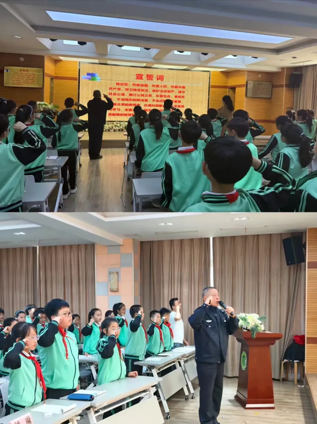 随后,全体学生在报告团3位老师的带领下庄严宣誓:“遵纪守法、拒绝欺凌、阳光成长、做遵纪守法的好少年!”