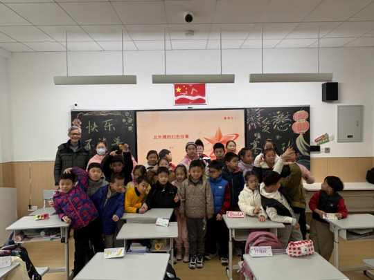 区投促办退休干部袁庆走进虹口区第四中心小学办班点,以“北外滩的红色记忆”为主题,带领孩子们一同回望那段峥嵘岁月。从汇山码头,一群怀揣救国理想的青年学子远赴法国勤工俭学,探寻真理的热血征程;到革命先烈王孝和,面对敌人的酷刑与威逼利诱,始终坚贞不屈、英勇就义的革命气节;再到解放战争时期,百老汇大厦、四川路桥旁,革命将士们浴血奋战的壮烈场景,袁庆娓娓道来、声情并茂,一个个鲜活的英雄形象、一段段刻骨铭心的红色往事,让孩子们沉浸式感受信仰的力量,在聆听中传承红色基因,厚植热爱家乡、热爱祖国的真挚情感。