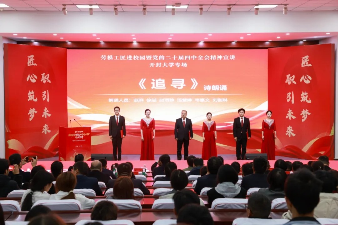 11月20日,“劳模工匠进校园”暨党的二十届四中全会精神宣讲在开封大学顺利举办。教育部关工委常务副主任王富,河南省总工会副主席、党组成员刘雪峰出席会议并讲话。省关工委副主任蔡永礼,省教育厅二级巡视员张水潮,省教育厅关工委副主任李敏,开封市人大常委会一级巡视员、市总工会主席钱忠宝,副市长刘震,市关工委常务副主任翟中州等出席。开封大学校长王德如致辞,校党委副书记张合主持。约200名师生代表参加活动。