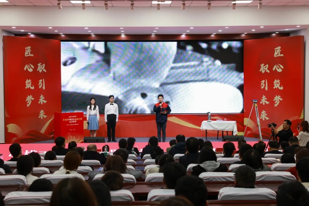 师生们通过精彩的诗朗诵与情景剧表演,表达了对大国工匠、全国劳模的敬意,以及立志技能报国的坚定信念。