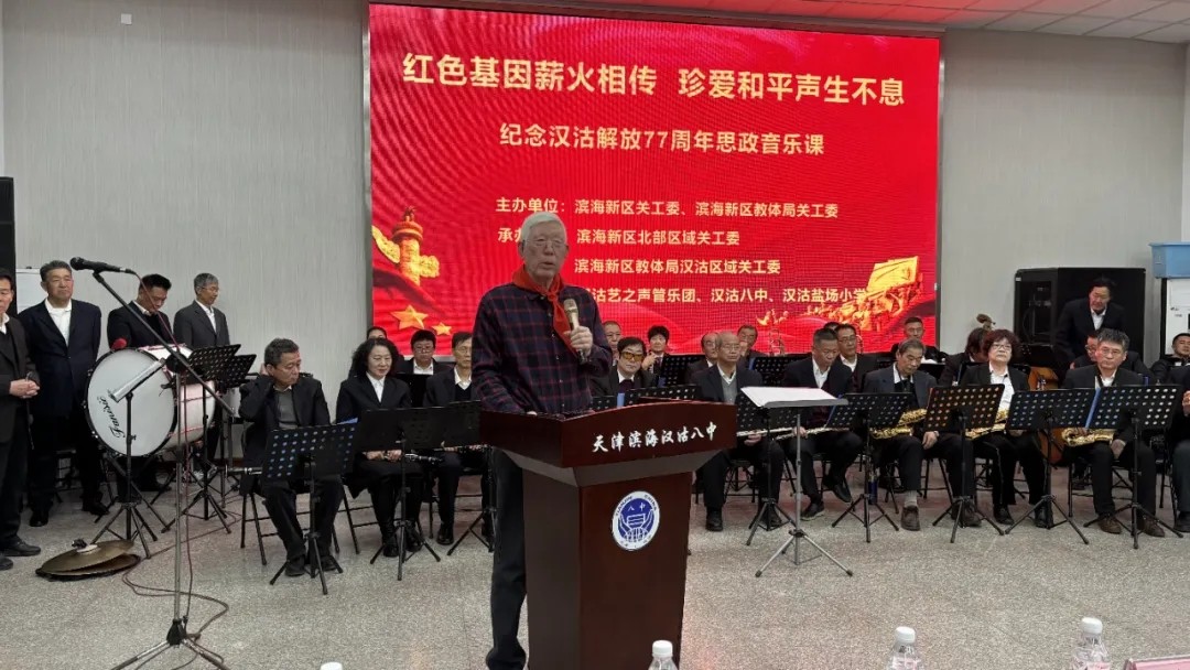 课程融合视频展播、故事讲述、革命文物展示与红色歌曲演奏演唱,使思政课可观、可听、可感。全国“最美五老”张励军讲述《汉沽解放的故事》,汉沽艺之声乐团的“五老”成员演唱、演奏《没有共产党就没有新中国》《解放军军歌》《战斗进行曲》《天下乡亲》《五星红旗》《歌唱祖国》等红色经典曲目,少先队员表演了情景剧《一条军毯的故事》。滨海新区关工委常务副主任高俊才表示,希望这堂思政课帮助同学们增进对家乡革命历史的了解,更深刻体悟自身肩负的时代责任,同学们要坚定理想信念、胸怀远大志向,把个人追求融入民族复兴伟业,要脚踏实地、勤学善思、提升创新能力;要锤炼品德、诚实守信,树立正确的世界观、人生观、价值观;要继承发扬革命先辈的光荣传统,从他们的奋斗故事中汲取力量,不畏艰难、砥砺前行。学生们表示,这堂思政音乐课让他们深入了解了家乡的革命历史,懂得了今天幸福生活的来之不易,要从先烈为民族解放和人民幸福不畏牺牲、奋勇前进的精神中汲取成长养分,让红色血脉永远传承。